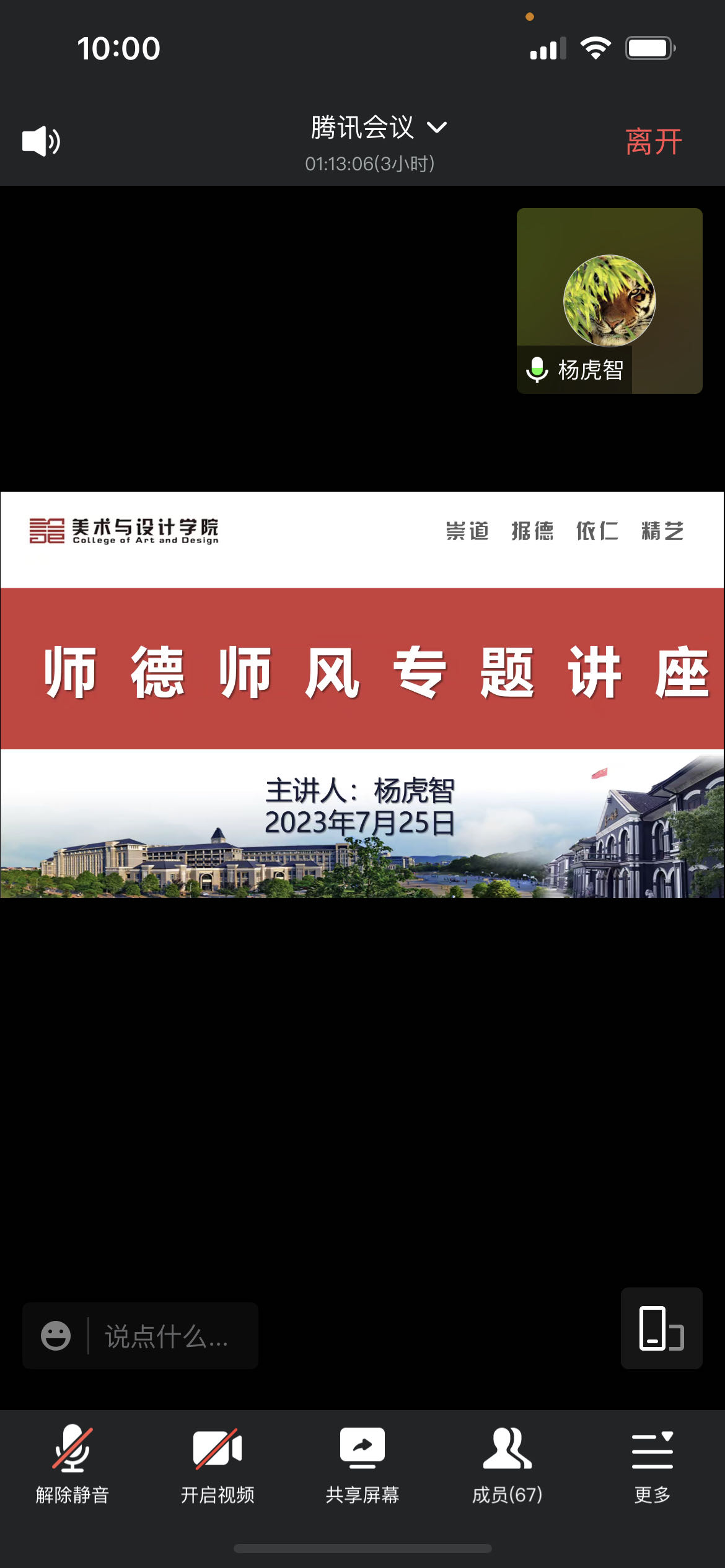 2023年7月25日上午,伟德bv1946官网师德师风专题党课在腾讯会议开讲,主讲人为院党委书记杨虎智,美设院全体教师参加。