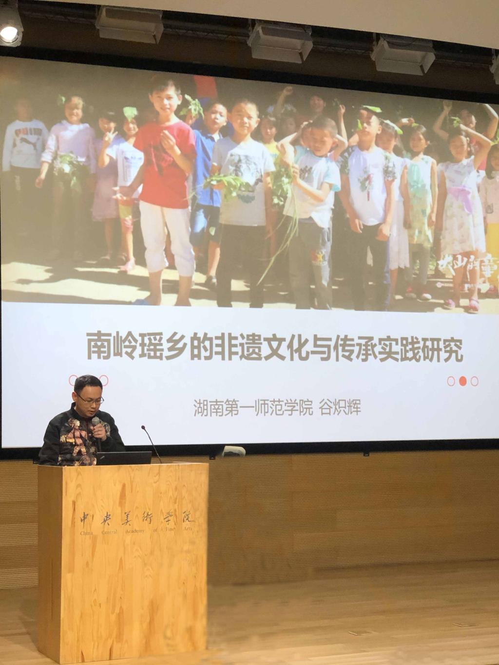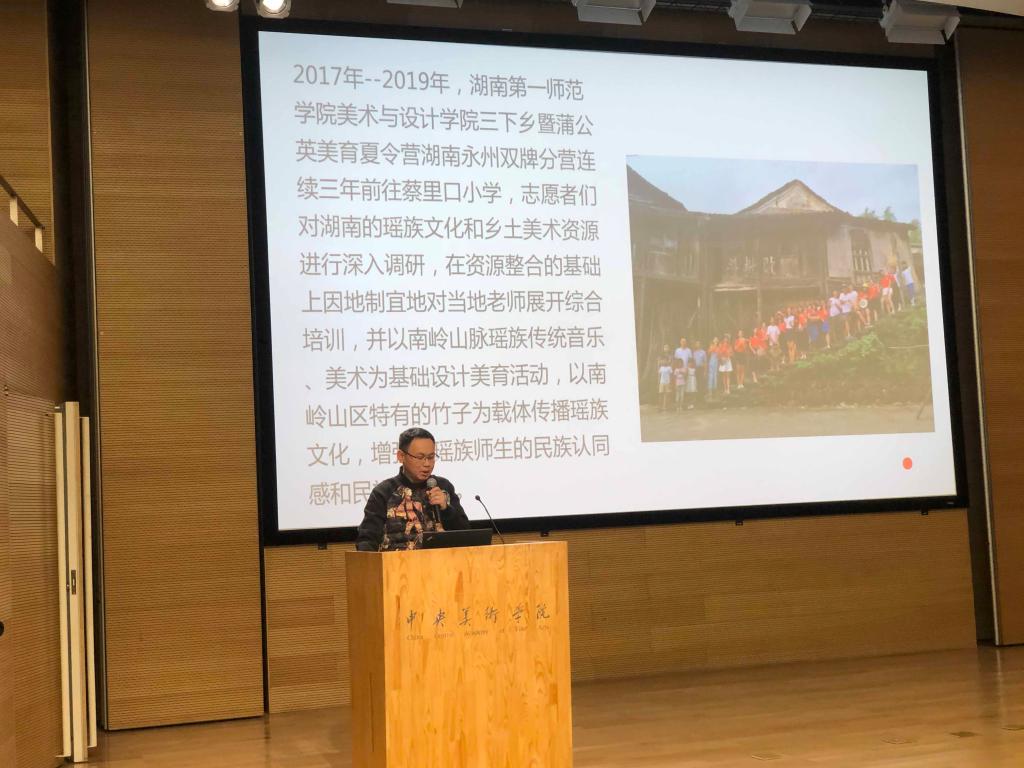 谷炽辉老师介绍导师工作坊工作成果并进行“南岭瑶乡的非遗文化与传承实践研究”主题演讲。主题演讲汇报了伟德bv1946官网持续三年在湖南省双牌县蔡里口小学开展的美育夏令营的工作情况,从用教育的方法促进瑶族文化在瑶族农村地区的传承和发展、将瑶族民间文化引入美术课堂和寻找资源为我所用、扩大活动影响力三个方面展开,最后提出因为美育夏令营等各方面的共同努力,一所湖南和广西交界的偏远村小在2019年9月10日获得了国家教育部“全国教育系统先进集体”的荣誉称号,引起了与会者的广泛兴趣,得到了他们的高度赞誉。他们一致认为,美育夏令营很有成效,向孩子们传承了丰富的民间美术知识,促进了教育公平,为基层乡村教师培训了美育能力,提升了校园环境,南岭瑶乡的非遗文化得到了较好的保护和传承。