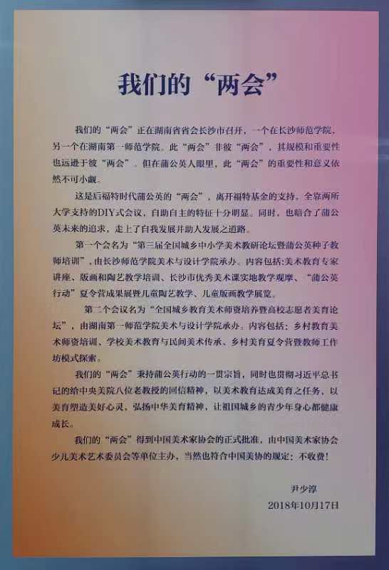 10月19日—20日,为期两天的“全国乡村教育美术师资培养暨高校志愿者美育论坛”在我校东方红校区举办。本届论坛根据《全面深化新时代教师队伍建设改革的意见》,理解和落实“好教育源自于好老师”,促进高校美术教育专业为乡村教育培养合格师资,推动高校关注乡村教育推进非遗文化进校园、民间美术进课堂,全面深入探索乡村学校艺术教育的途径与方法,面向全国邀集有关高校共同研讨乡村学校美术师资培养,推动乡村艺术教育工作方式。本次高校论坛立足于高师美术教育专业,探讨农村学校美术师资培养,总结和推广“蒲公英行动”高校青年志愿者经验,推进高校美术教育专业的发展与研究,同时将发起成立“全国高校蒲公英志愿者美育联盟。