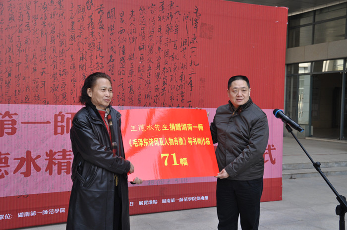 12月28日上午,《毛泽东与第一师范》王德水先生精品书画展暨捐赠仪式在美术楼举行。著名书画家、湖南大学教授、岳麓中华书画研究院院长、我校客座教授王德水,省委宣传部副部长孔和平,省委宣传部副部长、外宣办主任周湘,省政法委巡视员贾端森,湖南大学党委副书记唐亚阳,省委外宣办副主任苏璇,东南亚文化艺术交流协会副会长、中也艺术董事长刘德文,中国广播网主编李勇,我校党委书记彭小奇、校长肖湘愚、纪委书记阳柏苏应邀出席书画展开幕式和捐赠仪式。
