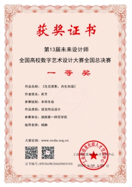 近日,2025未来设计师·全国高校数字艺术设计大赛(NCDA)获奖名单正式揭晓。该赛事在我校由伟德bv1946官网承办,我校多个学院学生积极参赛,历经校赛、省赛、国赛三级严苛遴选,最终斩获佳绩:国家级获奖项目4项,省级获奖项目27项,充分展现了我校学子在艺术设计领域的创新实力与实践素养。其中杨静老师,谭昕老师和杨蓓老师指导学生参赛的作品分别斩获国家一等奖,二等奖和三等奖。