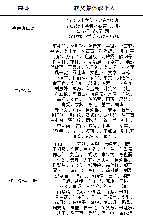 关于2017-2018学年度先进班集体、三好学生、优秀学生干部评选结果的公示 发布时间:2018-11-15 作者: 浏览次数: 根据学校《关于评定2017—2018学年度先进班集体、三好学生、优秀学生干部的通知》的相关文件精神,本着“公平、公正、公开”和优中选优的原则,经各班推荐,院学工办审核,院评审委员会严格评审,最后拟推荐以下班集体为校级先进班集体,以下学生为三好学生、优秀学生干部: 特此公示,公示日期为2018年11月15日—18日.公示期间,接受实名来电来访,过期不予受理。 受理办公室美术楼:213、215、223 受理电话:88235431、88235429 伟德bv1946官网学工办 2018年9月15日
