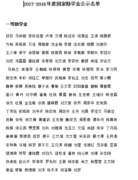 关于我院2017-2018学年度国家助学金评选结果的公示 发布时间:2018-10-15 作者: 浏览次数: 根据学校2017-2018奖助学金评选的相关文件精神,本着“公开、公正、公平”的原则,经各班申报、民主评议,院学工办审核,院奖助学金评定委员会最后严格评审,以下同学为我院2017-2018年度国家助学金拟上报人选。特此公示,公示期间2018年10月15日—20日,公示期间接受实名来电来访,过期不予受理。受理办公室:美术楼215,211,223.受理电话:88235431 88235429 伟德bv1946官网伟德bv1946官网 2018年10月15日