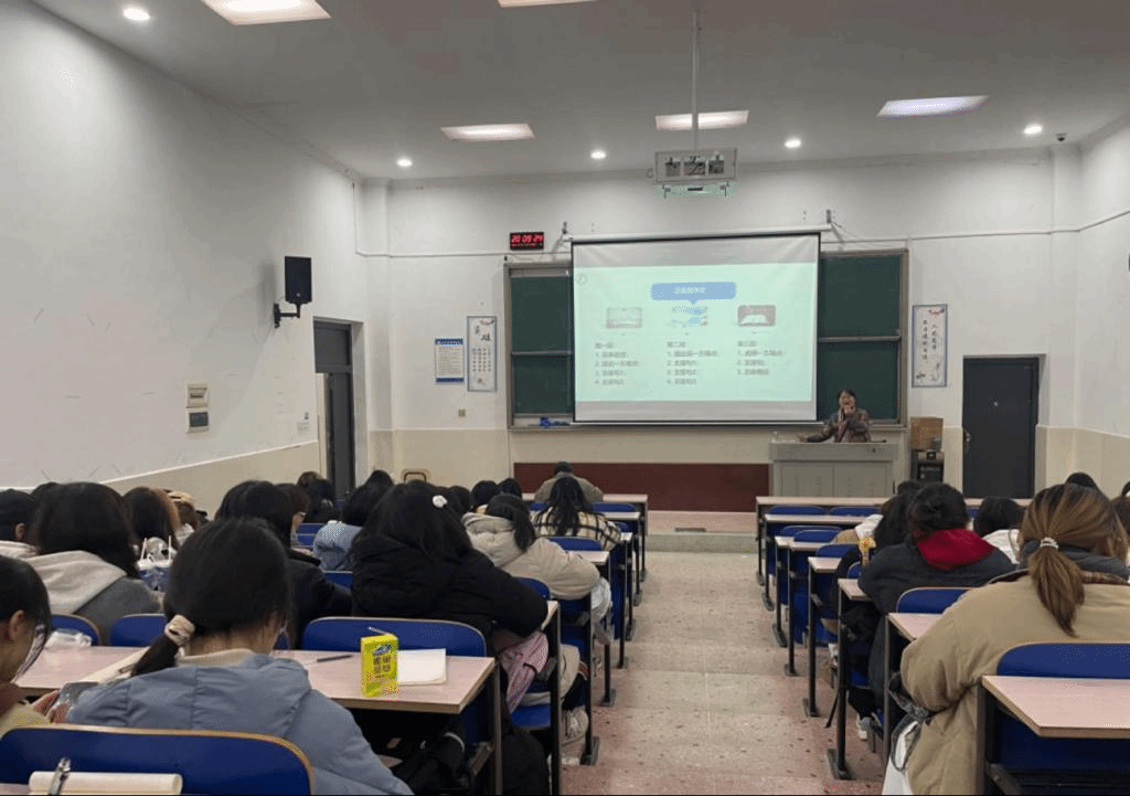 会议在全体师生热烈的掌声中正式开始。第一位主讲人龙君老师向会场内的老师及学生表示问候,言简意赅的对今天的讲座内容进行概括,简单介绍了四级考试各题型构成及分值、考试流程、听力理解题目构成、评分标准,并详细讲解了听力答题技巧、篇章翻译解题技巧。龙君老师的精彩演讲结束,同学们进行了五分钟的休整,又由晏小花老师继续分享四级考试的另外两个板块。她简要提及作文题目类型与考核点、阅读分值,以及深刻剖析了作文考试答题技巧、阅读分析做题技巧。讲座的最后,以同学们热烈的掌声作为结尾。