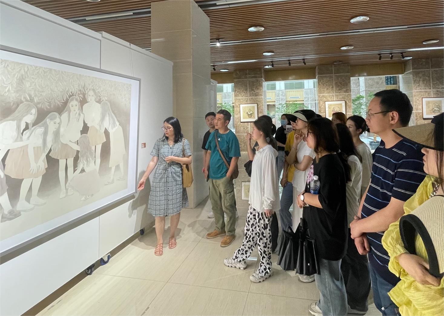 在重庆师范大学美术学院黄莎老师的讲解下,同学们在博雅楼展厅参观了美术学院2023届美术学(师范)专业本科和研究生毕业作品展。