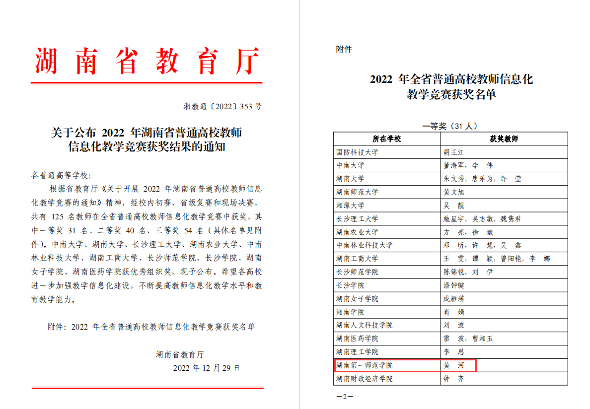 12月18日,2022年湖南省普通高校教师信息化教学竞赛决赛以线上形式举行。根据《湖南省普通高校教师信息化教学竞赛章程》规定,经初赛、复赛和线上决赛,在来自中湖南省52所普通高校的160位参加省复赛教师中,共有54位选手进入省决赛,评选出一等奖31名。我院黄河老师获得实践组一等奖。