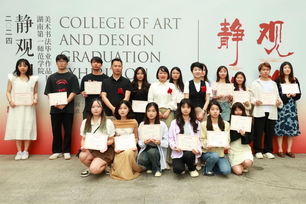 优秀指导教师代表曾素艳发言,她对2024届毕业生提出了殷切希望,激励他们在艺术的道路上勇往直前,保持初心,并期待他们未来取得更大的成绩。随后,2024届美术学专业优秀毕业生代表郑宁劲、书法学专业优秀毕业生代表范力鋒发言。他们代表全体毕业生表达了对恩师与母校的感激之情,同时回顾了四年大学生涯,展望了未来。刘峰宣读了优秀作品获奖名单,伟德bv1946官网领导班子为获奖毕业生颁发荣誉证书。蔡晓曦宣布伟德bv1946官网伟德bv1946官网2024届“静观和韵”美术书法毕业作品展正式开幕。
