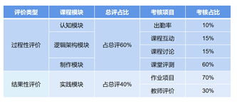 过程性评价与结果性评价相结合,该课程课程评价系统主要包括出勤率、课堂互动、课堂研讨、课堂评测、课堂评测、作业项目以及教师评价六个部分构成。