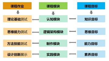 对应课程内容三个维度中四大模块的划分,课程作业通过理论基础、思维能力、方法技能和设计创新四个方面进行设计,以此来检验学生是否掌握了从理论过渡到实践的综合能力,从而达到课程建设中知识、思维、能力和素养四个目标。